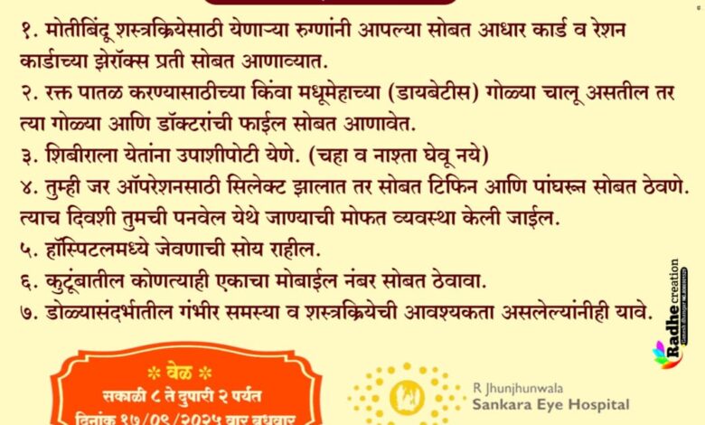 शिबिराला येणाऱ्या रुग्णांनी सोबत आधार कार्ड,रेशन कार्ड च्या झेरॉक्स प्रति,मधुमेह असणाऱ्यांनी डॉक्टरांची फाईल आणावी,उपाशी पोटी यावे,रुग्णाला ऑपरेशन करण्यास सांगितले तर तशा तयारीत पनवेल जाण्याच्या तयारीत यावे,जाण्याची मोफत व्यवस्था करण्यात आली आहे,हॉस्पिटल मध्ये जेवणाची सोय राहील,कुटुंबातील कोणाचाही एक मोबाईल नंबर जवळ ठेवावा,डोळ्याच्या संदर्भात गंभीर समस्या व शस्त्रक्रियेच्या रुग्णांनीही शिबिरात सहभागी व्हावे असे आवाहन आयोजकांनी केले आहे.