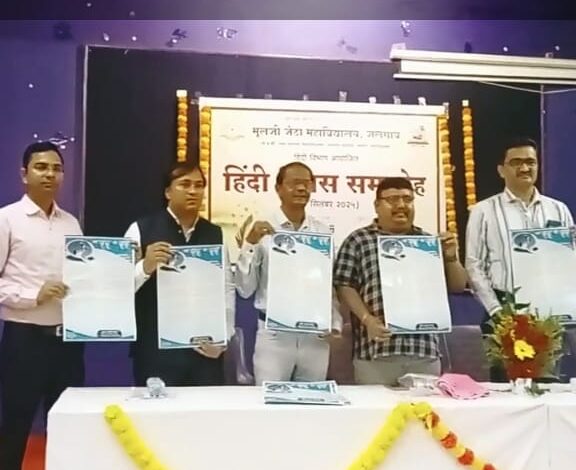 प्रतिनिधी – एरंडोल येथील राष्ट्रीय साहित्य संघाचे संयोजक तथा कवी प्रवीण आधार महाजन यांच्या प्यारे पापा या हिंदी कवितेच्या पोस्टर पोएट्री चे प्रकाशन केंद्रीय हिंदी संस्थान आग्रा चे संचालक तथा नवी दिल्ली येथील राष्ट्रीय सिंधी भाषा विकास परिषदचे निदेशक प्रा. डॉ. सुनील कुलकर्णी यांच्या हस्ते करण्यात आले. जळगाव येथील मु.जे. महाविद्यालयात झालेल्या राष्ट्रीय हिंदी पंधरवाडा कार्यक्रमाप्रसंगी मान्यवरांचे उपस्थितीत पोस्टर पोएट्री चे प्रकाशन करण्यात आले. कार्यक्रमाचे अध्यक्षस्थानी प्रा.डॉ.भूपेंद्र केसुर, साहित्य भारतीचे जिल्हा उपाध्यक्ष प्रा. डॉ. सुभाष महाले, प्रा. डॉ. विजय लोहार, प्रा. डॉ. रोशनी पवार अधिक व्यासपीठावर उपस्थित होते. यावेळी श्री महाजन यांनी प्यारे पापा या कवितेचे वाचन केले. त्यांच्या या हिंदी पोस्टर पोएट्री चे मान्यवरांनी कौतुक केले. याप्रसंगी धुळे विद्यावर्धिनी महाविद्यालयाचे प्रा. डॉ. योगेश पाटील, नूतन मराठा महाविद्यालयाचे प्रा. डॉ. राहुल संदानशीव, प्रा. विनोद अहिरे, प्रा. अंकिता दुबे, उज्वला पाटील, रणजी आडे आदी उपस्थित होते. या कार्यक्रमात प्रा. डॉ. विजय लोहार यांच्या रामावतार त्यागी और सुरेश भट या ग्रंथाचे प्रकाशन करण्यात आले. कार्यक्रमाचे प्रास्ताविक प्रा. डॉ रोशनी पवार यांनी तर कार्यक्रमाचे सूत्रसंचालन प्रा डॉ. विजय लोहार यांनी केले. आभार प्रा.डॉ. मनोज महाजन यांनी मानले. कार्यक्रमास विद्यार्थी विद्यार्थी विद्यार्थिनी मोठ्या संख्येने उपस्थित होते.